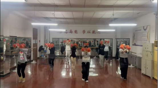 荣誉的背后,是队员们日复一日的刻苦坚守。由于训练队形需要较大场地,室内训练场地无法满足训练条件,备战期间,队员们只能在田径场地开展高强度训练。寒冬时节,凛冽的寒风中,他们身着单薄的训练服,一遍遍打磨动作细节——从花球手位的精准把控到队形变换的无缝衔接,从街舞节奏的精准踩点到团队配合的默契同步,每一个跳跃、每一次托举都经过了数十次甚至上百次的反复练习。手指冻得发红、膝盖磕出淤青,却没有一人退缩,大家相互鼓励、彼此支撑,用热血与坚持对抗严寒,将对啦啦操的热爱融入每一个训练瞬间。