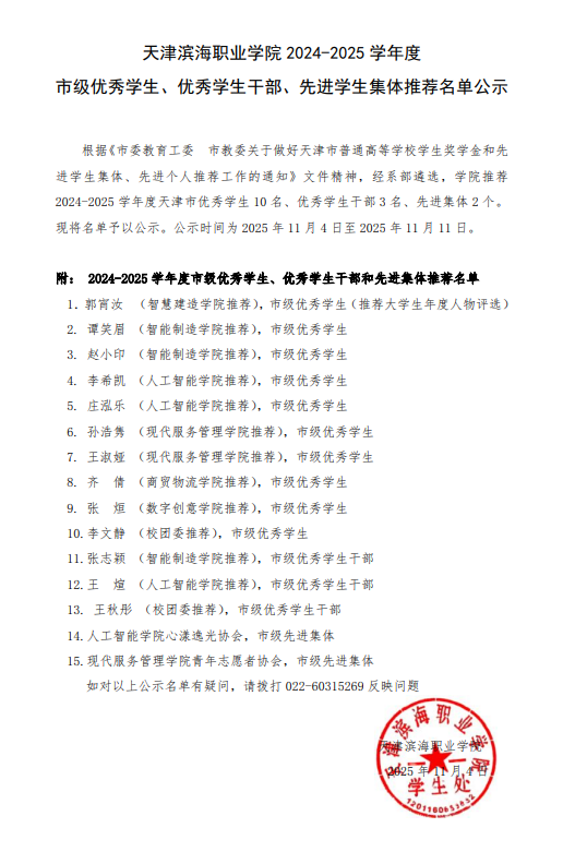 天津滨海职业学院2024-2025学年度 市级优秀学生、优秀学生干部、先进学生集体推荐名单公示 来源: 发布时间:2025-11-04 09:51:12 浏览次数: 次 【字体:小 大】 终审:贾瀛 分享到: 【打印正文】