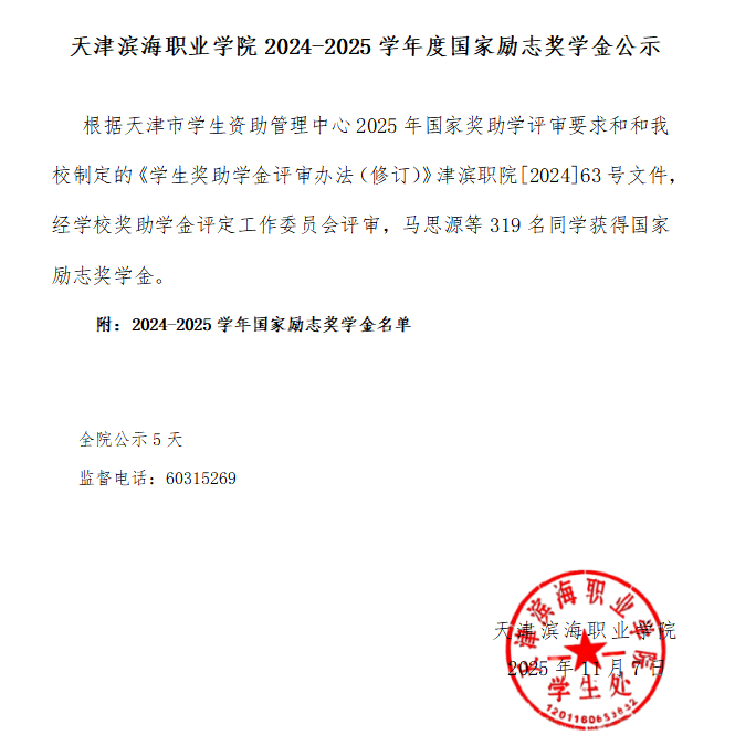 天津滨海职业学院2024-2025学年度国家励志奖学金公示 来源: 发布时间:2025-11-07 08:54:50 浏览次数: 次 【字体:小 大】 2024-2025学年度国家励志公示名单.xls 终审:贾瀛 分享到: 【打印正文】