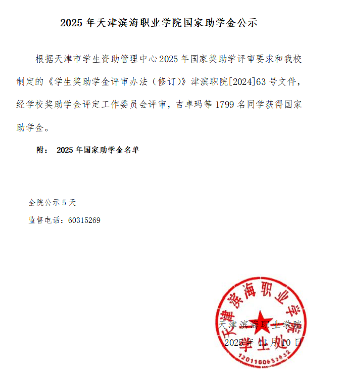 2025年天津滨海职业学院国家助学金公示 来源: 发布时间:2025-11-10 08:57:13 浏览次数: 次 【字体:小 大】 2025国家助学金公示名单.xlsx 终审:贾瀛 分享到: 【打印正文】